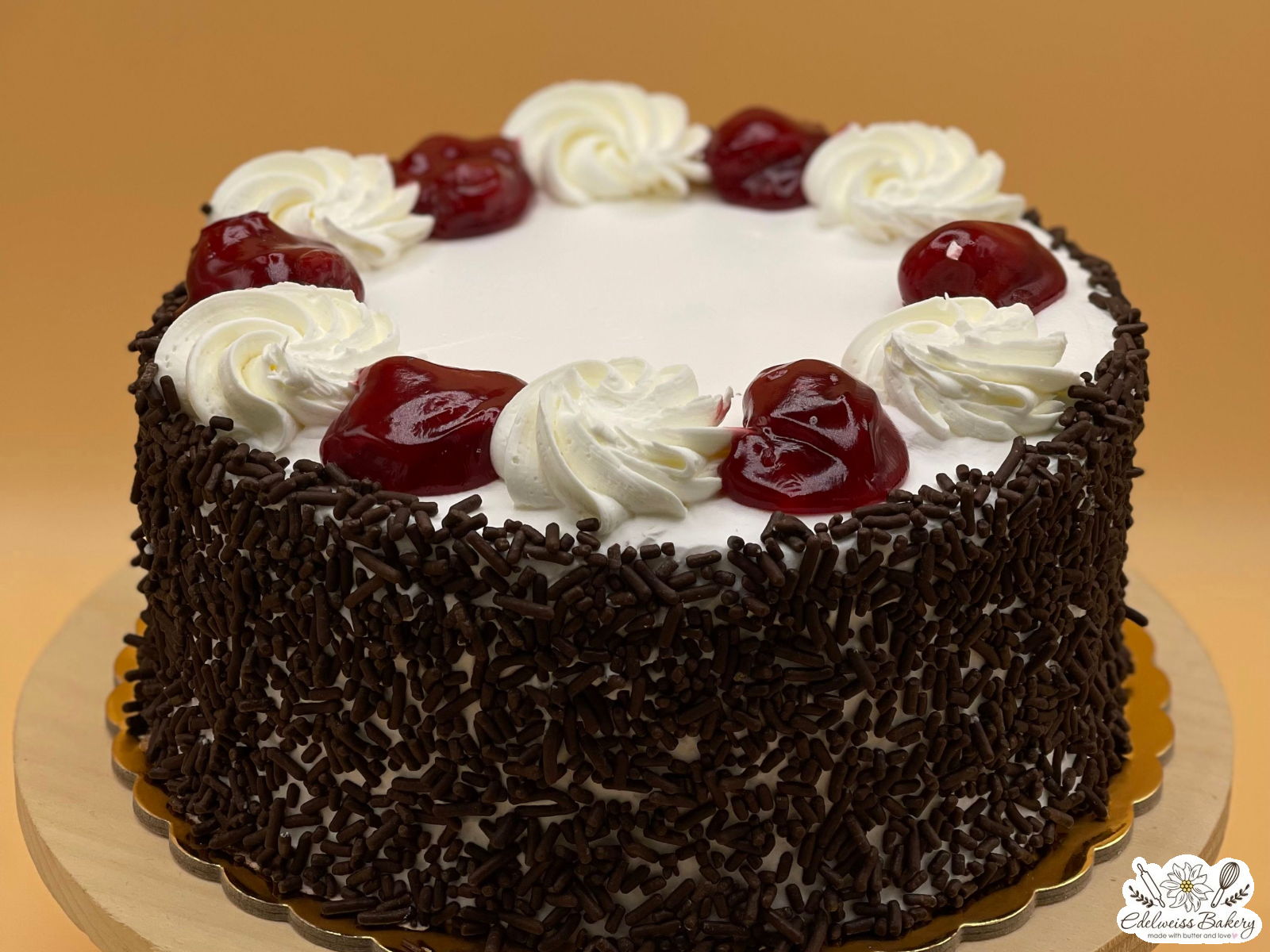 Dutch chocolate sponge cake filled with our Bavarian Cream and Cherries. Topped with Whip Cream Shavings and cherries