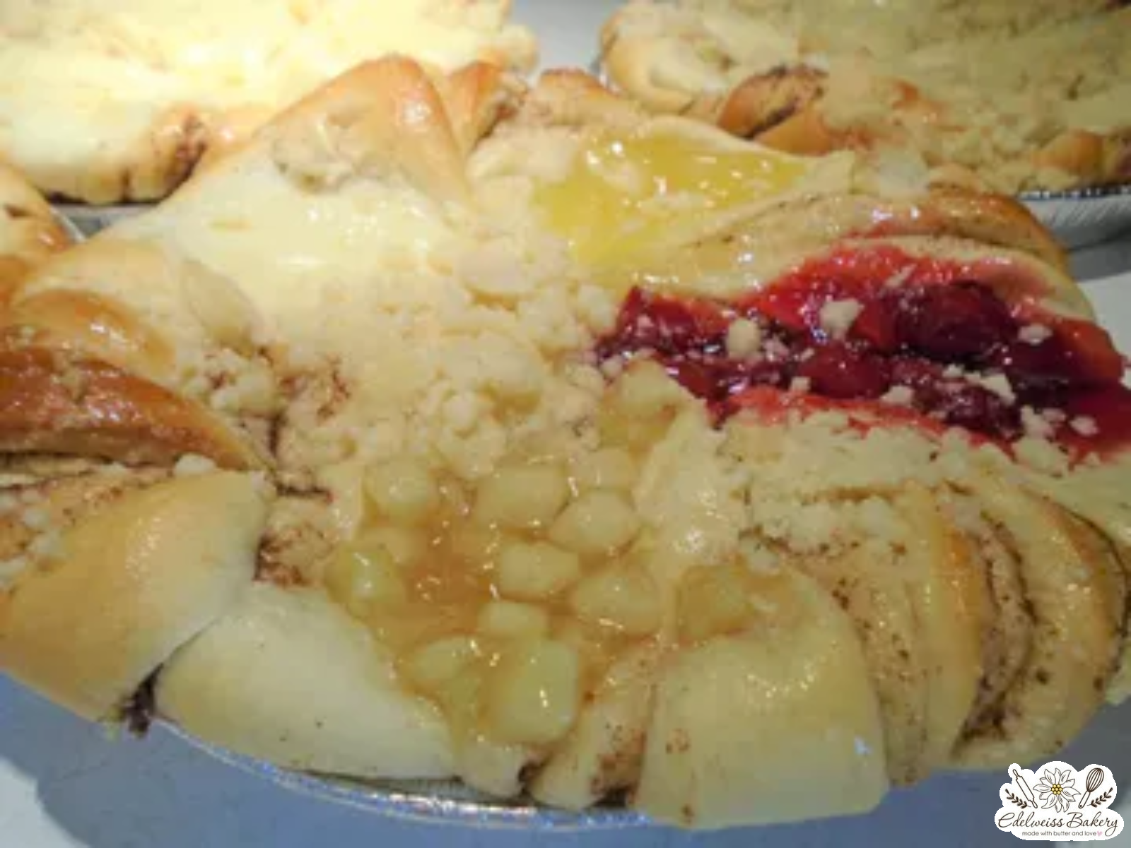 Traditional yeast dough coffee cake baked with Cheese, Cherry, Apple, and Apricot.