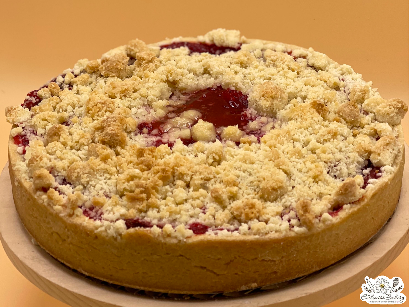 Our butter crust shell filled with strawberry and rhubarb like grandma used to make.   Topped with our buttery streusel crumbles.       Available Daily.