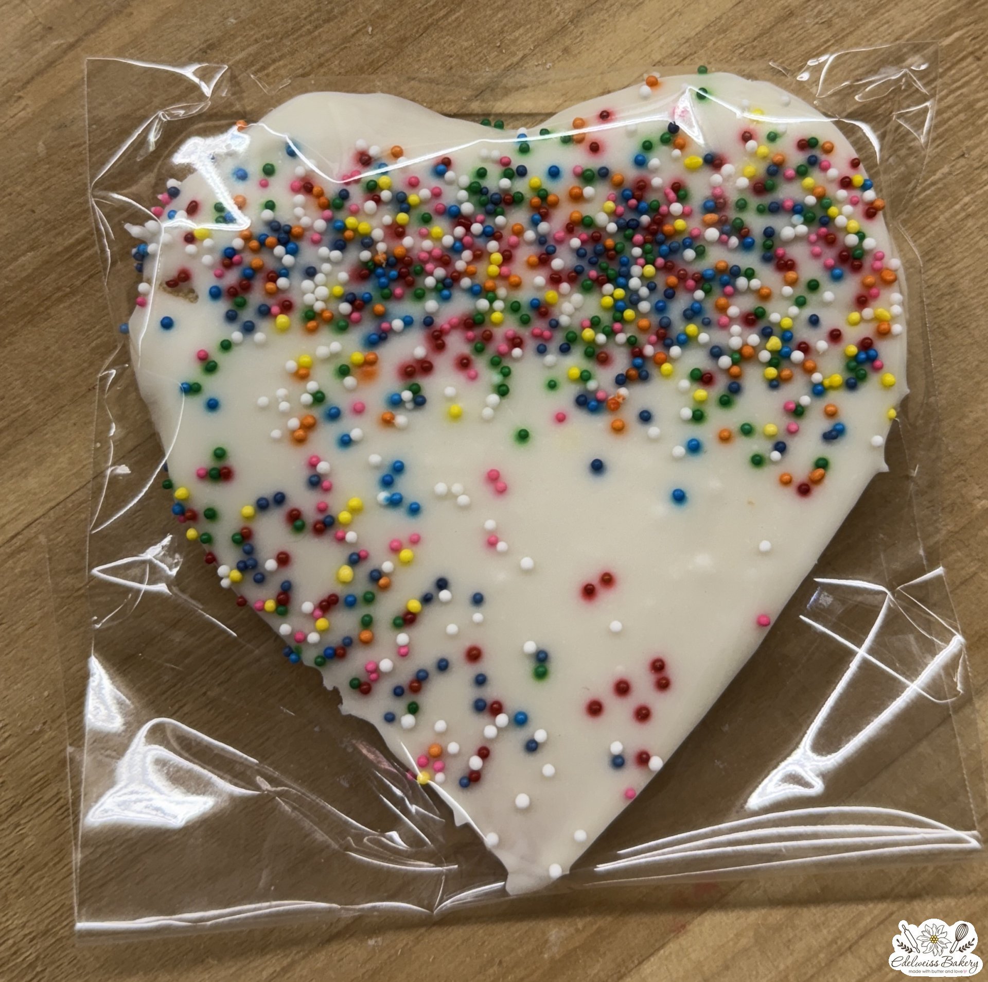 Butter cookie in a heart shape with sugar icing and rainbow sprinkles