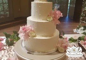 White Smooth Buttercream cake designed with buttercream pearl dots and accented with fresh flowers by florist
